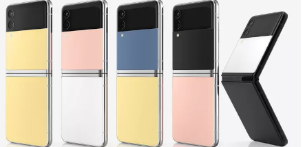 结果是GalaxyZFlip3定制版的49种不同可能排列的调色板,每个客户都可以混合搭配他们选择的手机框架(黑色或银色)以及蓝色、黄色、粉红色、白色和背面的颜色。黑色的。