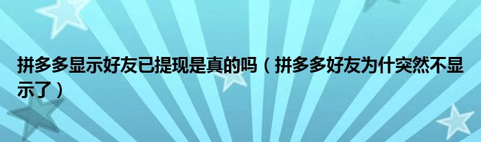 大家好,跳跳为你解答以上问题。拼多多显示好友已提现是真的吗,拼多多好友为什突然不显示了这个问题很多人还不知道,现在让我们一起来看看吧!