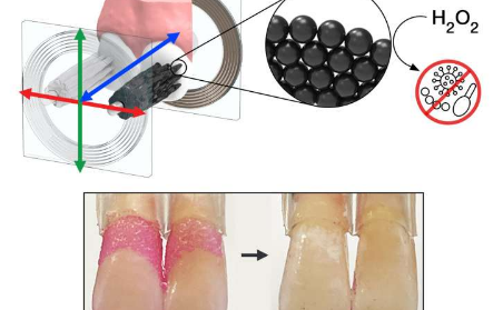 这些微型机器人的组成部分是具有催化和磁活性的氧化铁纳米颗粒。使用磁场,研究人员可以引导他们的运动和配置形成刷毛状结构,从牙齿宽阔的表面清除牙菌斑,或者形成细长的细绳,可以像牙线一样在牙齿之间滑动。在这两种情况下,催化反应都会驱动纳米颗粒产生抗菌剂,从而在现场杀死有害的口腔细菌。