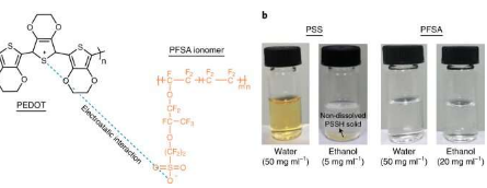 研究人员推出的新型聚合物复合物PEDOT:F具有全氟硫酸离聚物作为抗衡离子。与PEDOT:PSS中所含的那些相比,这些离聚物可以分散在水和酒精中。