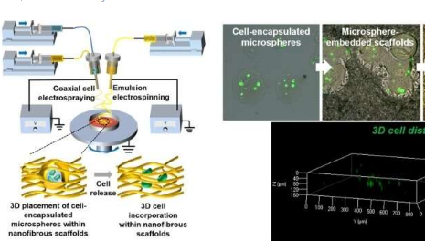 通过同时进行乳液静电纺丝和同轴细胞电喷雾,该方法可以将活的内皮细胞直接置于3-D生物活性纳米纤维支架内。