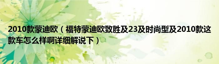 1,福特蒙迪欧致胜 23 时尚型 2010款这款车怎么样啊详细解说下 :还不错吧,车外观很大气,又很动感,2.3时尚虽然是自动波最低配的,但是就有真皮座椅还有天窗,6速手自一体的波箱,就有一点不尽人意就是发动机才2.3,力稍显不足!
