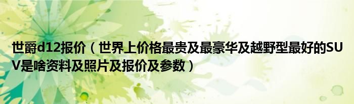 大家好,小常来为大家解答以下问题,对于世爵d12报价,世界上价格最贵及最豪华及越野型最好的SUV是啥资料及照片及报价及参数很多人还不知道,今天让我们一起来看看吧!