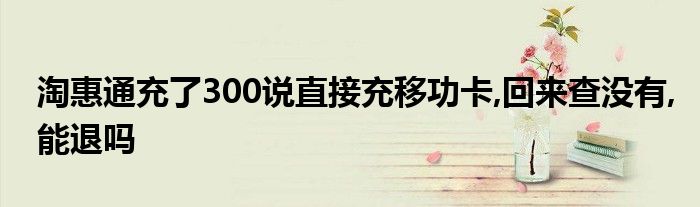大家好,小联来为大家解答以上的问题。淘惠通充了300说直接充移功卡,回来查没有,能退吗这个很多人还不知道,现在让我们一起来看看吧!
